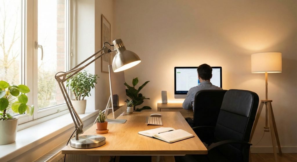 Good lighting isn’t just about having a desk lamp — it’s about creating a comfortable visual environment. Natural light during the day, combined with focused task lighting and soft ambient light, reduces eye strain and keeps you energized for longer work sessions.